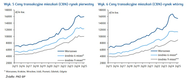 Na rynku deweloperskim oferta mieszkań w sześciu największych aglomeracjach osiągnęła rekordowy poziom 61,6 tys. lokali (+28% r/r, +4% k/k). Czas sprzedaży wynosi obecnie około 6 kwartałów, a udział gotowych mieszkań w ofercie wzrósł do 14%. Jednocześnie przedpłaty na rachunki deweloperów spadły o 36%, co odzwierciedla niższy popyt w poprzednich kwartałach.