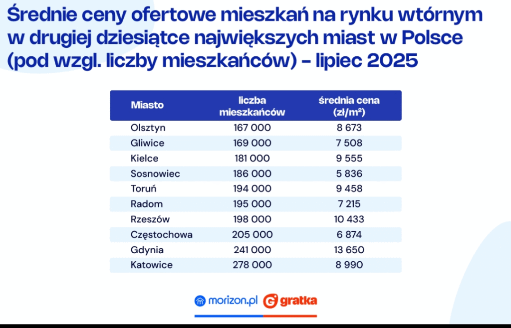 W nieruchomościach często słyszymy, że najbezpieczniej inwestować w TOP 6 czy TOP 10 największych miast, bo tam rynek jest najbardziej płynny. Tymczasem dane pokazują, że również w drugiej dziesiątce największych ośrodków miejskich można znaleźć ciekawe okazje i atrakcyjne warunki do życia.Według GUS na 1 stycznia 2025 roku w Polsce funkcjonuje 1020 miast. Wśród nich warto zwrócić uwagę na Sosnowiec – dziesięciokrotnie mniejszy od Warszawy, a jednocześnie z przeciętną ceną na rynku wtórnym na poziomie 5836 zł/m². To niemal trzykrotnie mniej niż w stolicy. Po przeciwnej stronie znajduje się Gdynia, gdzie średnia cena ofertowa sięga już 13 650 zł/m², co czyni ją najdroższym miastem z tej grupy. Wysokie ceny utrzymują się także w Rzeszowie (10 433 zł/m²) i Kielcach (9555 zł/m²).