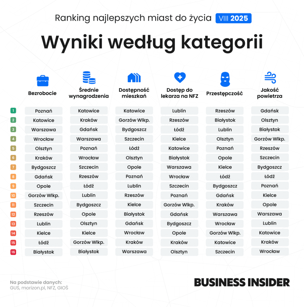 Ale atrakcyjność miasta to nie tylko ceny mieszkań. Według rankingu Business Insider z sierpnia 2025 najwyżej oceniane pod kątem jakości życia są właśnie miasta z drugiej dziesiątki – m.in. Katowice i Rzeszów. Brano pod uwagę sześć kategorii: poziom bezrobocia, wysokość wynagrodzeń, dostępność mieszkań, dostęp do lekarzy w ramach NFZ, poziom przestępczości i jakość powietrza.