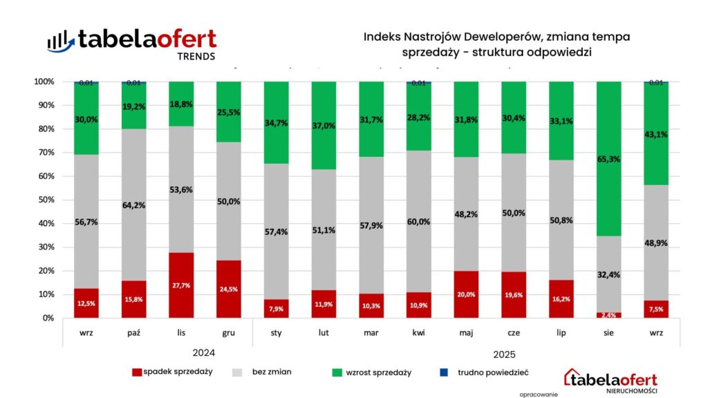 Sprzedaż mieszkań również nie zwalnia tempa. Wrzesień przyniósł wzrost o 38,8% w porównaniu z sierpniem, a aż 43,1% deweloperów spodziewa się dalszego zwiększenia popytu. Tylko 8% ankietowanych firm patrzy w przyszłość pesymistycznie.