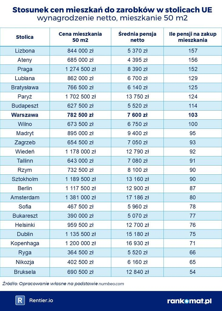 Nowe dane jasno pokazują, że w Warszawie wciąż trudno mówić o łatwym dostępie do własnego „M”. Zakup 50-metrowego mieszkania wymaga dziś od mieszkańca zgromadzenia równowartości 103 średnich pensji netto. To wynik, który plasuje polską stolicę dopiero na 13. miejscu wśród stolic Unii Europejskiej pod względem dostępności mieszkań – daleko za miastami Europy Zachodniej, gdzie relacja pensji do cen nieruchomości jest znacznie bardziej korzystna.