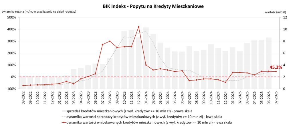 Wrzesień 2025 potwierdził, że zainteresowanie kredytami hipotecznymi utrzymuje się na wysokim poziomie. Z danych BIK Indeksu Popytu na Kredyty Mieszkaniowe wynika, że banki i SKOK-i przesłały zapytania o kredyty mieszkaniowe na kwotę aż o 42,2% wyższą niż rok wcześniej. To jeden z lepszych wyników w ostatnich kwartałach i sygnał, że Polacy znów coraz śmielej wracają po kredyty mieszkaniowe.