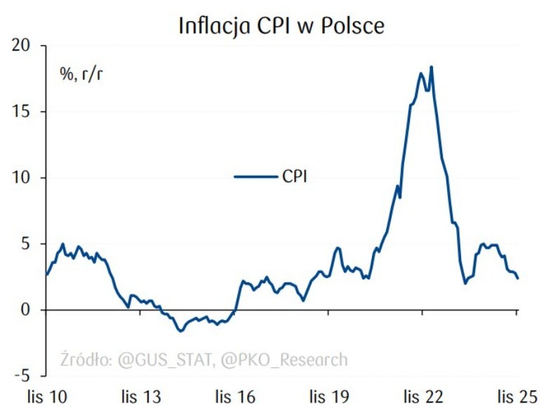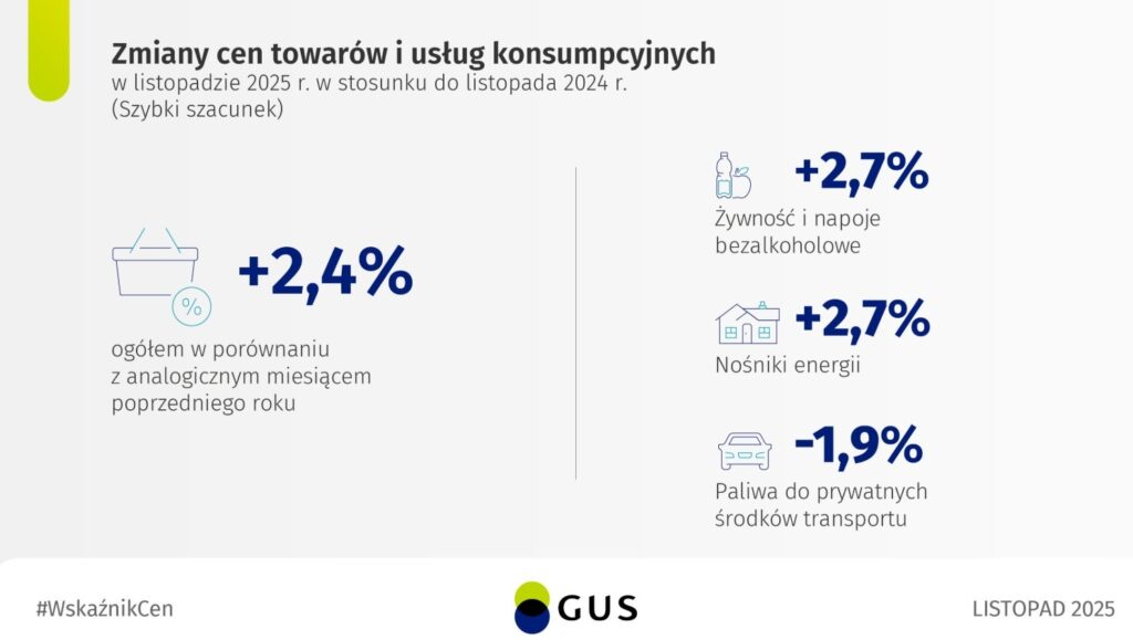 Według szybkiego szacunku GUS inflacja CPI w listopadzie 2025 r. wyniosła 2,4% rok do roku. To mniej niż prognoza NBP (2,8%) i konsensus ekonomistów (ok. 2,5-2,6%). Po raz pierwszy od dłuższego czasu inflacja znalazła się poniżej celu NBP 2,5%, co od razu uruchomiło pytania o kolejną obniżkę stóp procentowych.