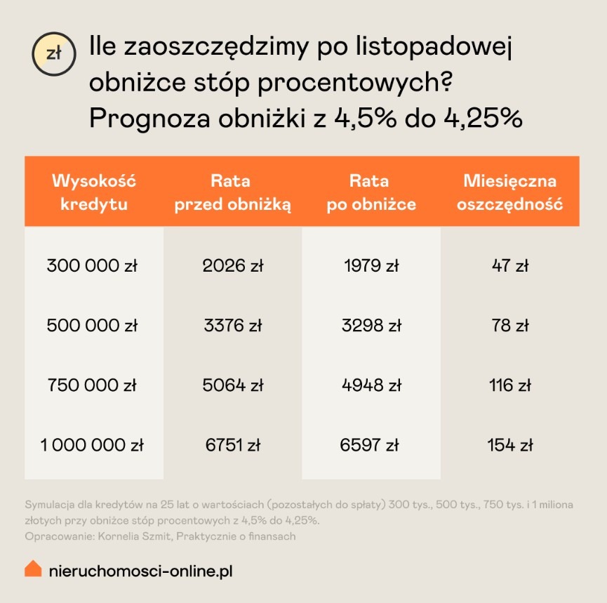 Dla kredytobiorców najważniejsze pytanie brzmi dziś nie „dlaczego RPP obniżyła stopy”, ale „ile spadnie rata kredytu po listopadowej obniżce stóp procentowych”. Na podstawie symulacji dla kredytów na 25 lat, przy obniżce z 4,5% do 4,25%, otrzymujemy następujący obraz: