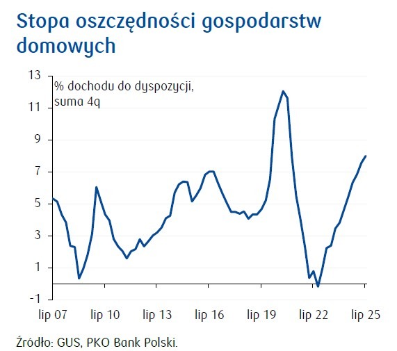 Głównym motorem wzrostu naszych zasobów jest dynamiczny wzrost dochodów z pracy, który w III kwartale 2025 r. wyniósł imponujące 11% rok do roku. Co jednak istotne, nasze wydatki konsumpcyjne nie podążają tym samym tempem. Konsumpcja wzrosła w tym samym czasie zaledwie o 3,5% r/r.
