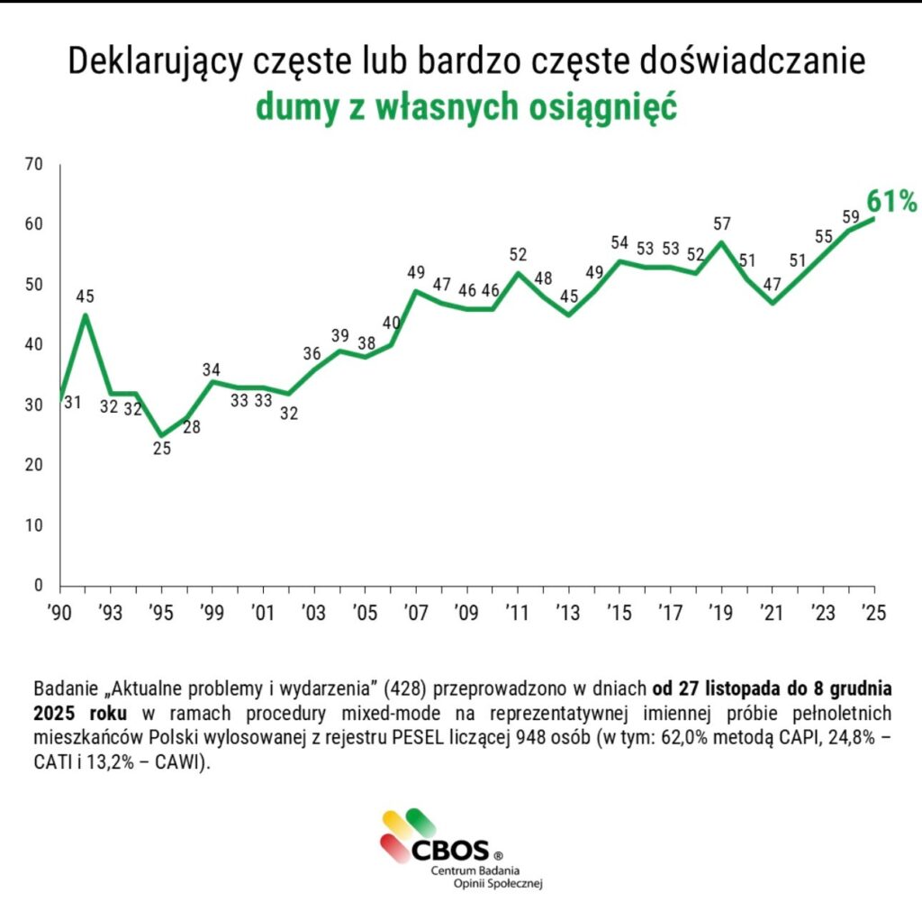 Według sondażu CBOS przeprowadzonego na przełomie listopada i grudnia 2025 roku, odsetek osób odczuwających dumę z własnych osiągnięć osiągnął rekordowy poziom. Już 61% badanych deklaruje, że często lub bardzo często doświadcza satysfakcji ze swoich dokonań. To najwyższy wynik od 1990 roku, czyli od początku prowadzenia tego badania.