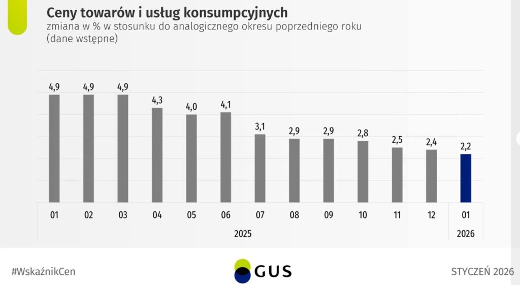 Kolejne dane napływające z gospodarki przynoszą pozytywne informacje dla kredytobiorców i budżetów domowych. Według wstępnych odczytów Głównego Urzędu Statystycznego (GUS), inflacja konsumencka (CPI) w styczniu 2026 roku wyniosła zaledwie 2,2% w ujęciu rocznym. Z kolei w perspektywie miesiąc do miesiąca ceny wzrosły o 0,6%.