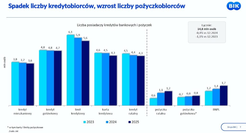 Co niezwykle interesujące, tak znacznemu wzrostowi wartości udzielonego finansowania towarzyszy odwrotny trend w kontekście liczby samych klientów. Raport BIK jednoznacznie wskazuje, że w 2025 roku liczba nowych kredytobiorców na rynku hipotecznym zmniejszyła się o 2,7% rok do roku.