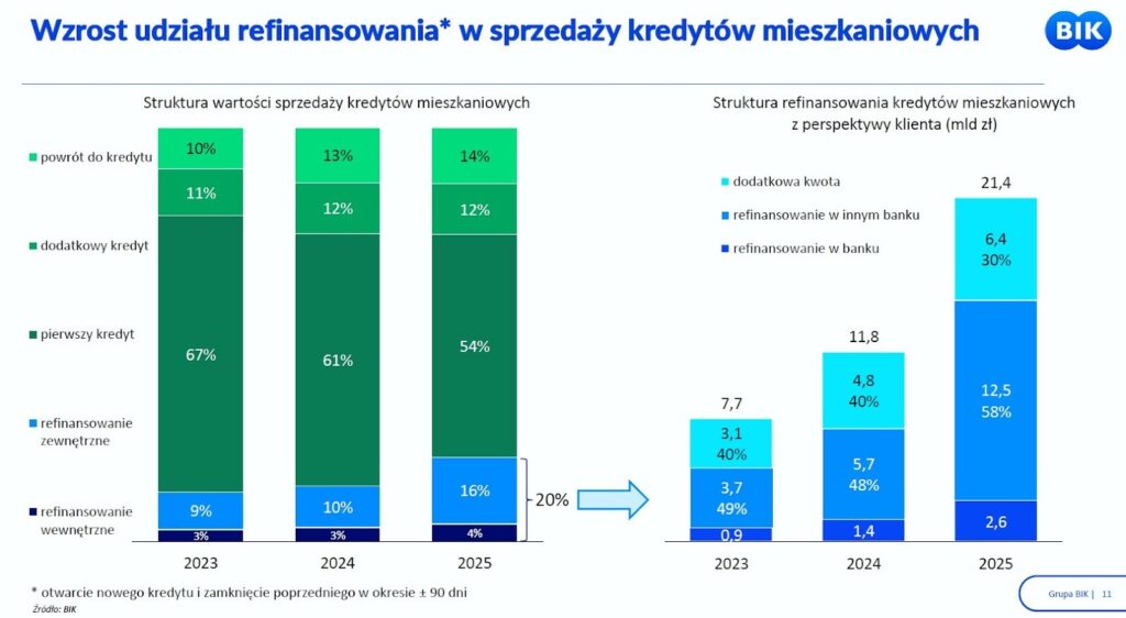 Ten rekordowy poziom nadpłat jest bardzo silnie skorelowany z innym, wyraźnym zjawiskiem na rynku – rosnącą popularnością refinansowania. Przeniesienie zobowiązania na lepszych warunkach stanowiło aż 20% wszystkich nowo udzielonych kredytów mieszkaniowych w 2025 roku. Kredytobiorcy zdecydowanie chętniej decydowali się na refinansowanie w zupełnie innej instytucji (16%), rzadziej wybierając negocjacje i aneksowanie umowy we własnym banku (4%).